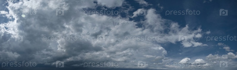 Россия. Юг Западной Сибири. Панорама дневного летнего неба с кучевыми облаками над полями Кузнецкого Алатау