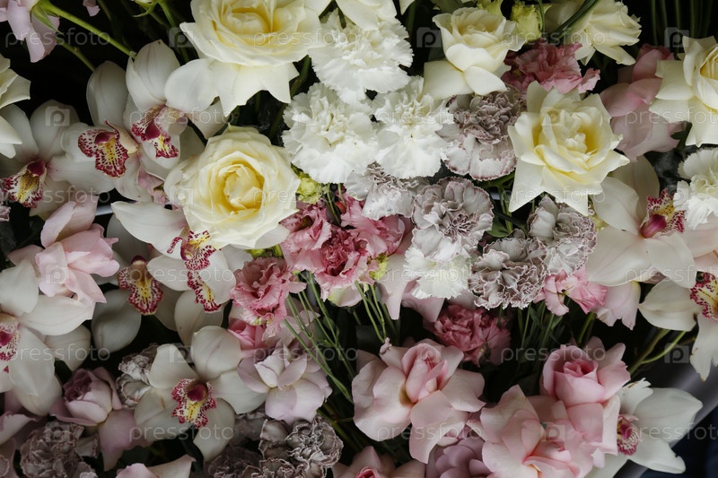Цветочная композиция из розовых и белых роз, орхидей ,гвоздик