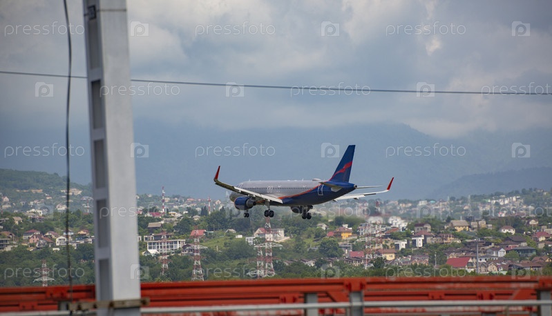 Пассажирский самолет заходит на посадку на фоне города в районе аэропорта Сочи