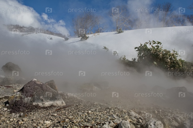 Россия. Курильские острова. Живописный плавучий термальный источник (Кипящая река) недалеко от вулкана Барановский на острове Итуруп, температура воды в источнике которого достигает 80 градусов