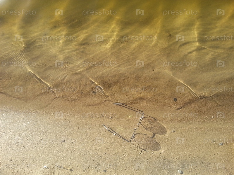 Крупный план солнцезащитных очков, модных очков круглой формы, размещенных на пляже, на берегу моря, фон концепции тропического пляжного отдыха, отражение на песке