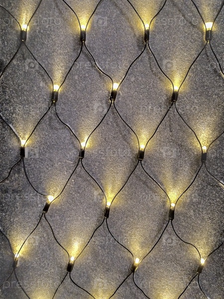 Рождественская гирлянда из светодиодных фонарей, Светлая стена в праздничных огнях, замороженная. Праздник, торжество, ромбовидная текстура