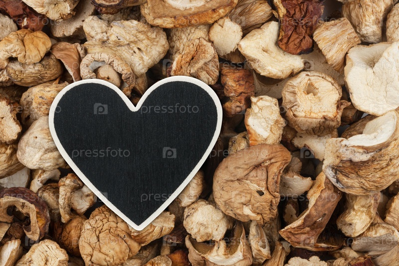 Указатель сердца, ценник лежит на сушеном грибе