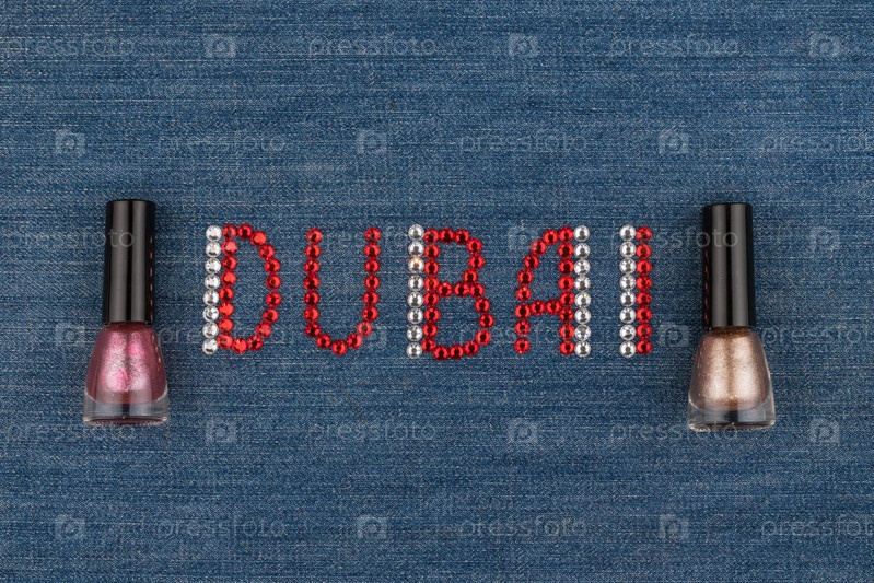 Слово 'Дубай', выполненное из полос, инкрустировано на ткани джинсов