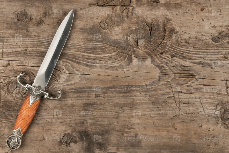 Нож, кинжал на деревянной поверхности, с местом для текста
