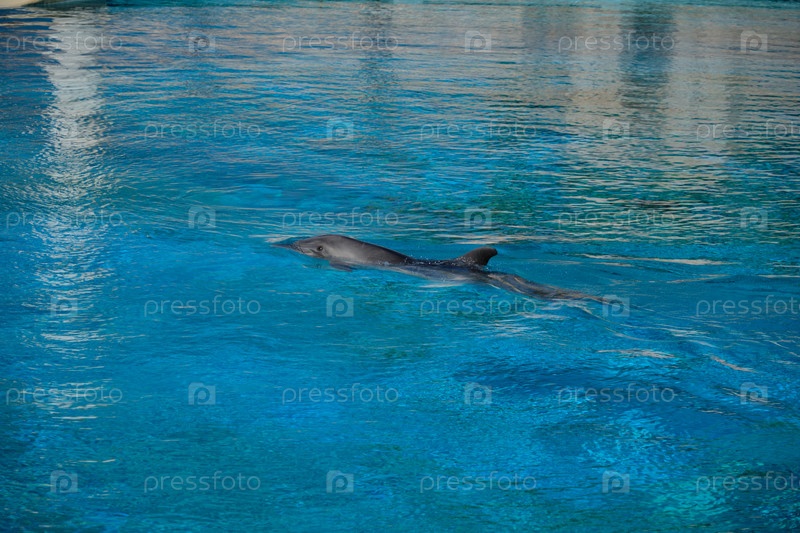 Дельфин плавает в кристально чистых голубых водах дельфинария. Отдых на базе отдыха недалеко от побережья Черного моря. Турция