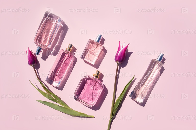 Набор флаконов для духов различной формы на сиреневом фоне с нежными розовыми тюльпанами. Плоская планировка. Вид сверху. Презентация весенних ароматов