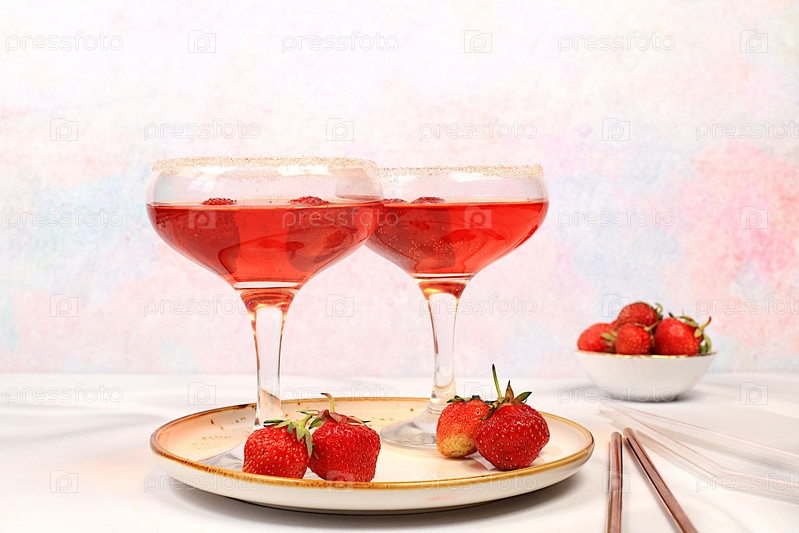 Праздничный алкогольный коктейль, красное мартини в стаканах на ярком фоне с клубникой, концепция летнего бара, алкогольные напитки на вечеринке, реклама ресторана и кафе, избирательный фокус