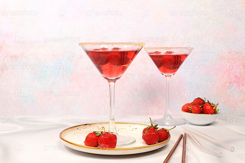 Праздничный алкогольный коктейль, красное мартини в стаканах на ярком фоне с клубникой, концепция летнего бара, алкогольные напитки на вечеринке, реклама ресторана и кафе, избирательный фокус
