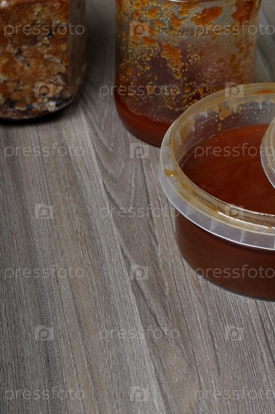 Мед в контейнере. Рядом отдельные емкости с арахисом и семечками. Ингредиенты для приготовления халвы
