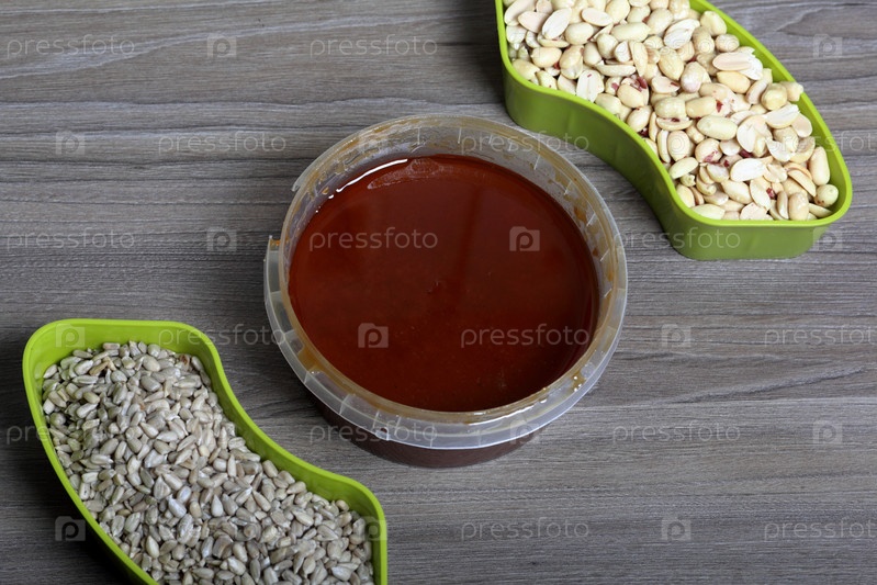 Мед в контейнере. Рядом отдельные емкости с арахисом и семечками. Ингредиенты для приготовления халвы