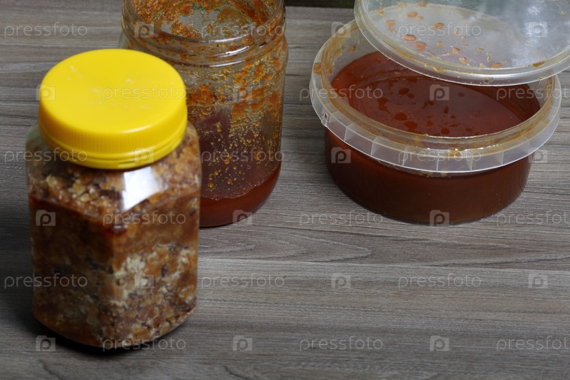 Мед разных видов в банках. Некоторые открыты и уже начали использоваться. Ингредиенты для приготовления халвы