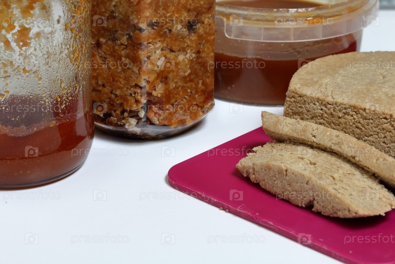 Нарезанная халва из меда, арахиса и семян подсолнечника. Рядом мед в разных емкостях. Ингредиенты и инструменты для приготовления халвы