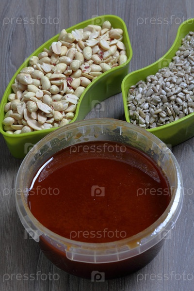 Мед в контейнере. Рядом отдельные емкости с арахисом и семечками. Ингредиенты для приготовления халвы