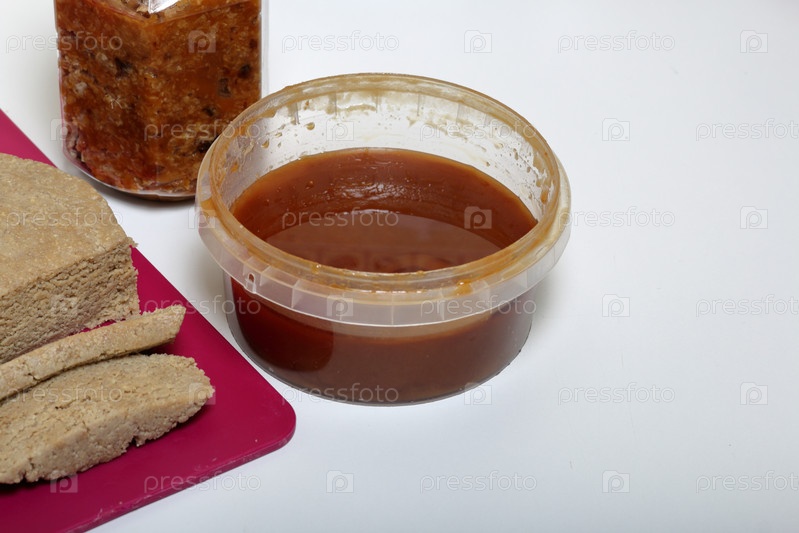 Нарезанная халва из меда, арахиса и семян подсолнечника. Рядом мед в разных емкостях. Ингредиенты и инструменты для приготовления халвы