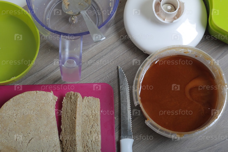 Нарезанная халва из меда, арахиса и семян подсолнечника. Следующий мед в контейнере. Ингредиенты и инструменты для приготовления халвы