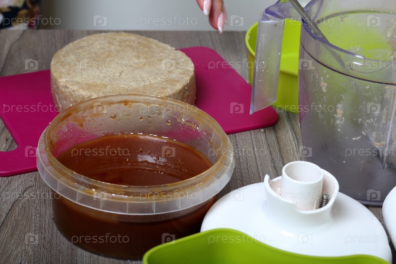 Халва из меда, арахиса и семян подсолнечника. Следующий мед в контейнере. Ингредиенты и инструменты для приготовления халвы