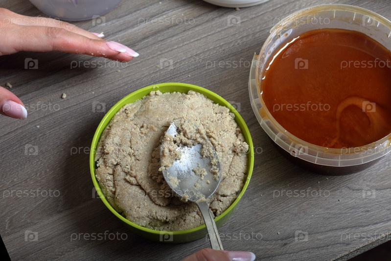 Женщина запечатывает ложкой приготовленную халву из меда, арахиса и семян подсолнечника. Следующий мед в контейнере. Ингредиенты и инструменты для приготовления халвы
