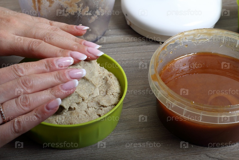 Женщина запечатывает руками приготовленную халву из меда, арахиса и семян подсолнечника. Следующий мед в контейнере. Ингредиенты и инструменты для приготовления халвы
