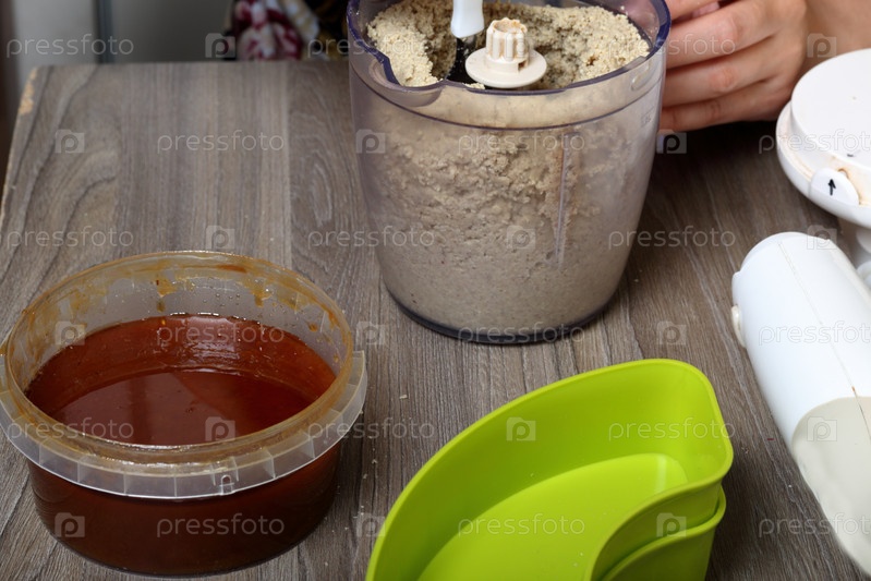 Мед в контейнере. Рядом в блендере измельчить арахис и семечки. Ингредиенты и инструменты для приготовления халвы