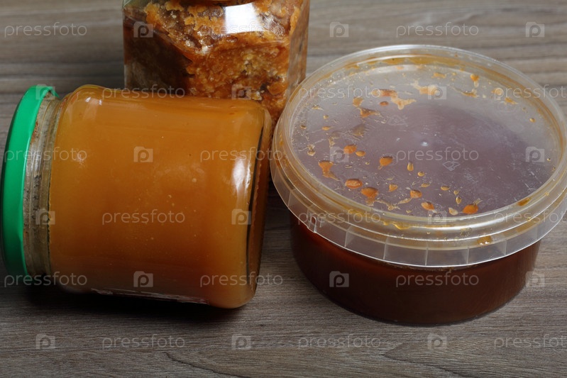 Мед в контейнере. Рядом отдельные емкости с арахисом и семечками. Ингредиенты для приготовления халвы
