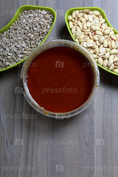 Мед в контейнере. Рядом отдельные емкости с арахисом и семечками. Ингредиенты для приготовления халвы