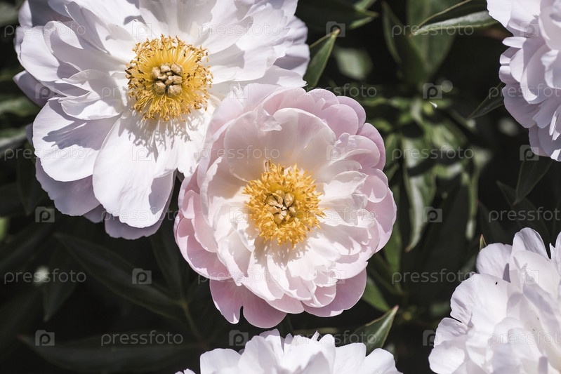 Крупный план цветущих белых пионов. Цветы и бутоны пиона в весеннем саду. Зеленый естественный фон. Цветущий сад. Красивое боке