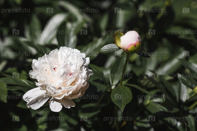 Крупный план цветущих белых пионов. Цветы и бутоны пиона в весеннем саду. Зеленый естественный фон. Цветущий сад. Красивое боке