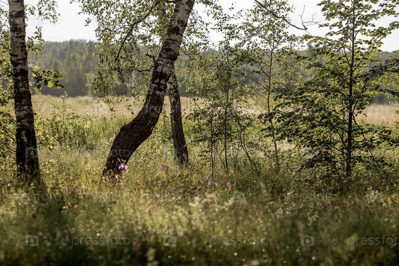 Летний пейзаж. Русская природа и культура. Красивый фон березовой рощи. Береза с распускающимися листьями