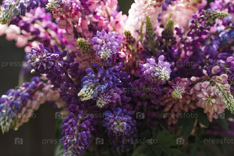 Букет цветущих люпинов в вазе (Lupinus polyphyllus) Цветение полевых крупнолистных или садовых люпин в начале лета, большой план с выборочным фокусом
