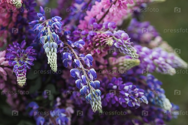 Букет цветущих люпинов в вазе (Lupinus polyphyllus) Цветение полевых крупнолистных или садовых люпин в начале лета, большой план с выборочным фокусом