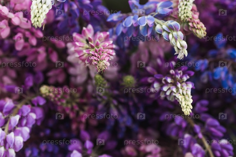 Букет цветущих люпинов в вазе (Lupinus polyphyllus) Цветение полевых крупнолистных или садовых люпин в начале лета, большой план с выборочным фокусом