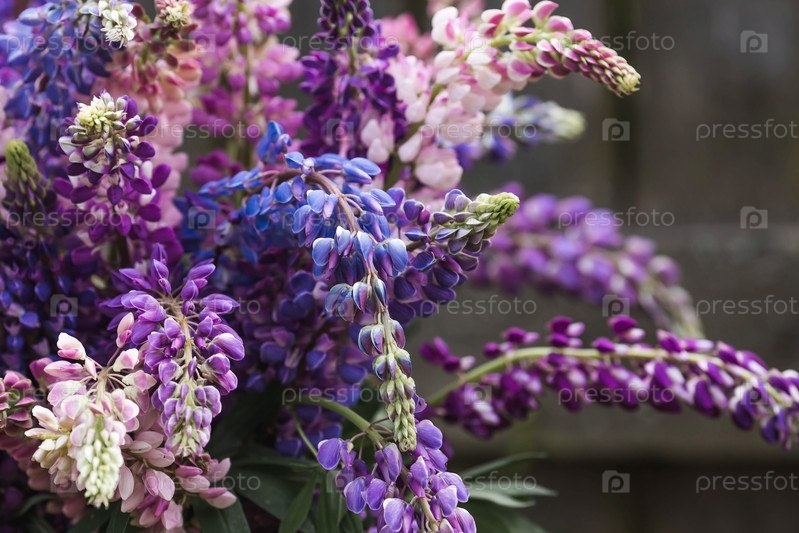 Букет цветущих люпинов в вазе (Lupinus polyphyllus) Цветение полевых крупнолистных или садовых люпин в начале лета, большой план с выборочным фокусом