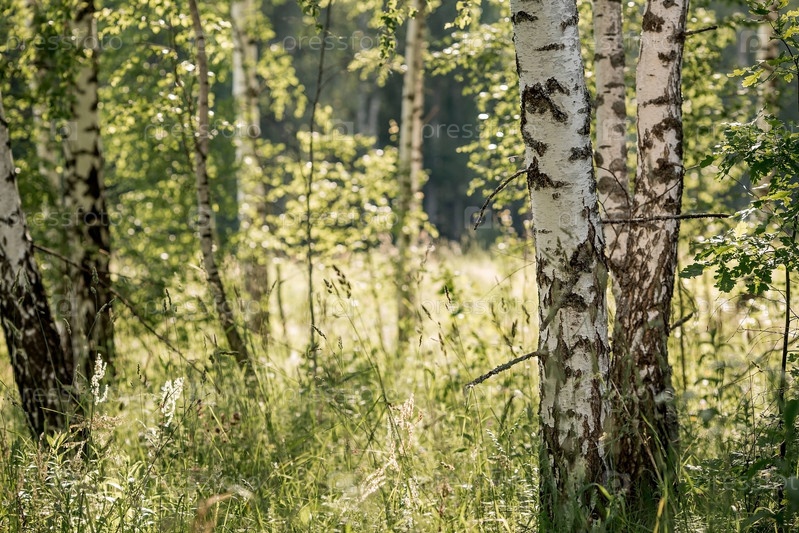 Летний пейзаж. Русская природа и культура. Красивый фон березовой рощи. Береза с распускающимися листьями