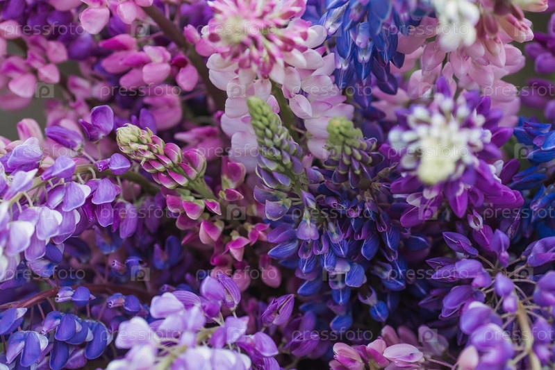 Букет цветущих люпинов в вазе (Lupinus polyphyllus) Цветение полевых крупнолистных или садовых люпин в начале лета, большой план с выборочным фокусом