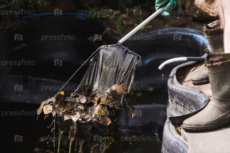 Садовник очищает декоративный пруд от листвы и грязи. Строительство и очистка декоративного пруда в саду. Ландшафтный дизайн
