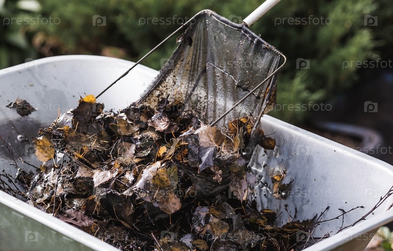 Садовник очищает декоративный пруд от листвы и грязи. Строительство и очистка декоративного пруда в саду. Ландшафтный дизайн