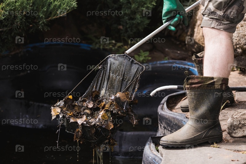 Садовник очищает декоративный пруд от листвы и грязи. Строительство и очистка декоративного пруда в саду. Ландшафтный дизайн