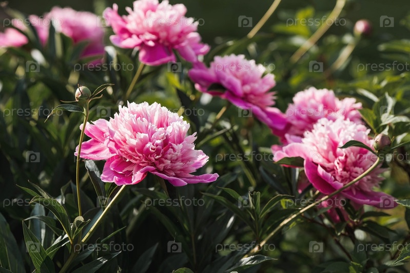 Крупный план цветущих розовых пионов. Цветы и бутоны пиона в весеннем саду. Зеленый естественный фон. Цветущий сад. Красивое боке