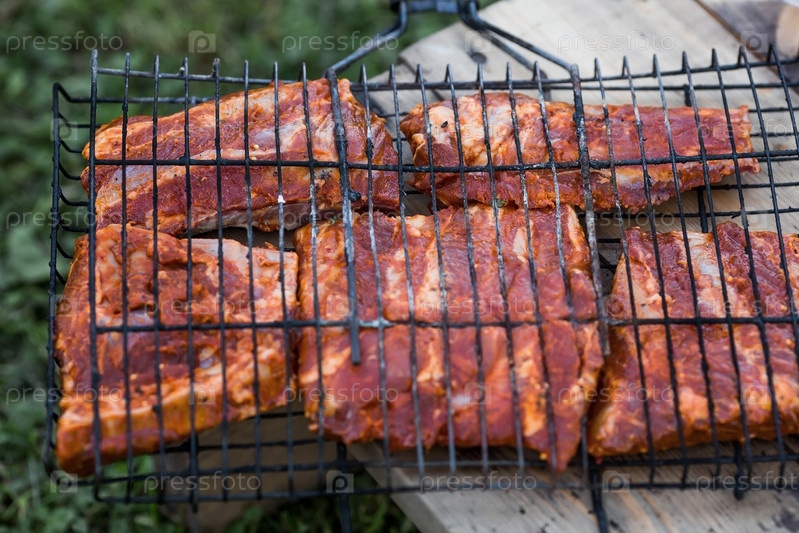 Барбекю на даче. Майские праздники. Барбекю на природе. Процесс приготовления мяса на гриле, крупный план. Шашлык из свиных ребрышек на мангале