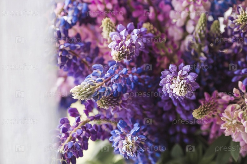 Букет цветущих люпинов в вазе (Lupinus polyphyllus) Цветение полевых крупнолистных или садовых люпин в начале лета, большой план с выборочным фокусом