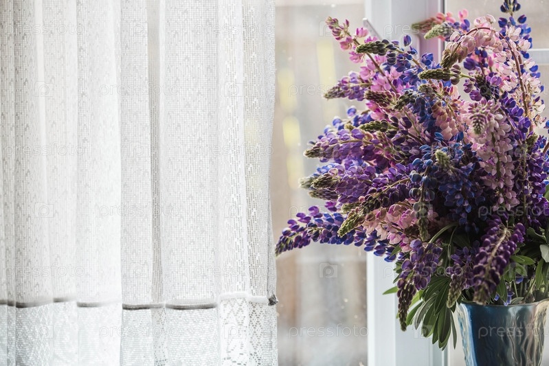 Букет цветущих люпинов в вазе (Lupinus polyphyllus) Цветение полевых крупнолистных или садовых люпин в начале лета, большой план с выборочным фокусом