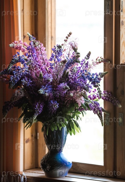 Букет цветущих люпинов в вазе (Lupinus polyphyllus) Цветение полевых крупнолистных или садовых люпин в начале лета, большой план с выборочным фокусом