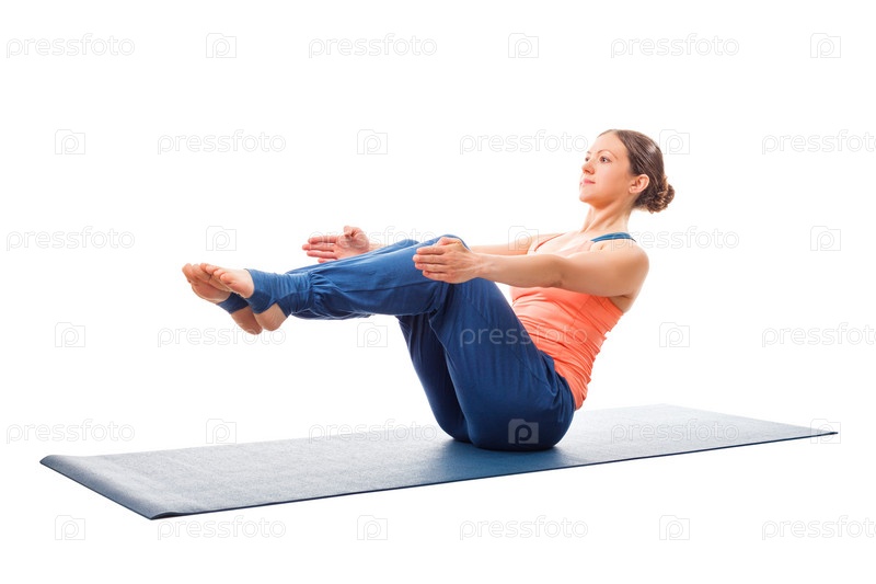 Спортивная женщина, занимающаяся йогой Аштанга Виньяса асана Парипурна Навасана
