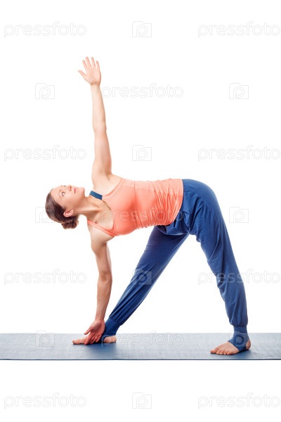 Спортивная женщина занимается йогой асана уттхита триконасана