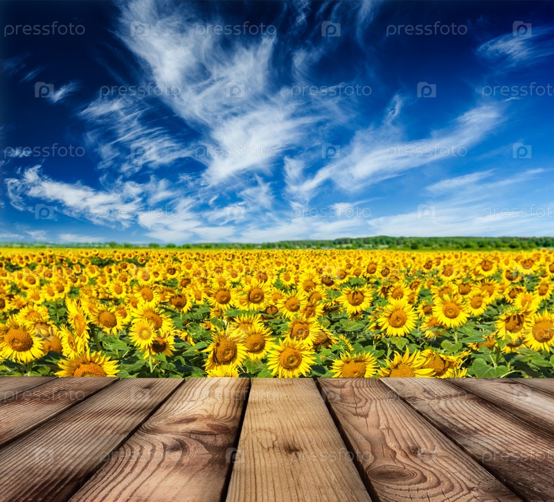 Деревянный пол с полем подсолнечника и голубым небом на заднем плане