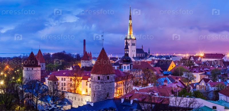 Панорама с воздуха на средневековый Старый город Таллина с церковью Святого Олафа и городской стеной Таллина, освещенной вечером, Эстония