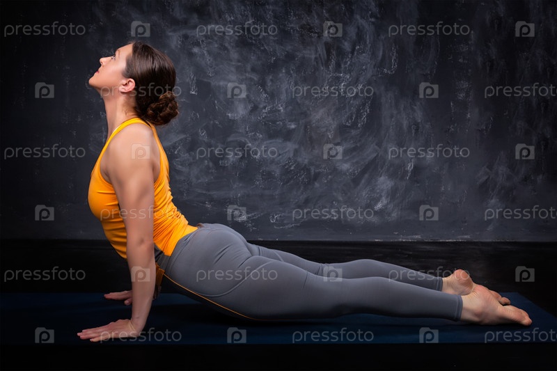 Спортивная женщина-йогиня практикует асану йоги Урдхва мукха сванас