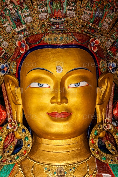 Статуя Будды Майтрейи крупным планом в Тиксей Гомпе. Ладакх, Индия