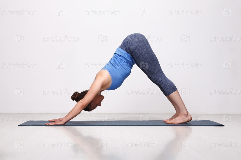 Красивая спортивная женщина-йогиня практикует асану йоги адхомуха шванасана - поза собаки мордой вниз в студии